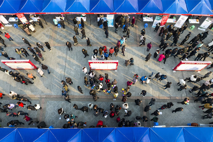 2023年1月31日,在四川省阆中市人民广场,求职者参加东西部劳务协作暨春风行动大型招聘会(无人机照片)。 新华社发(王玉贵 摄)