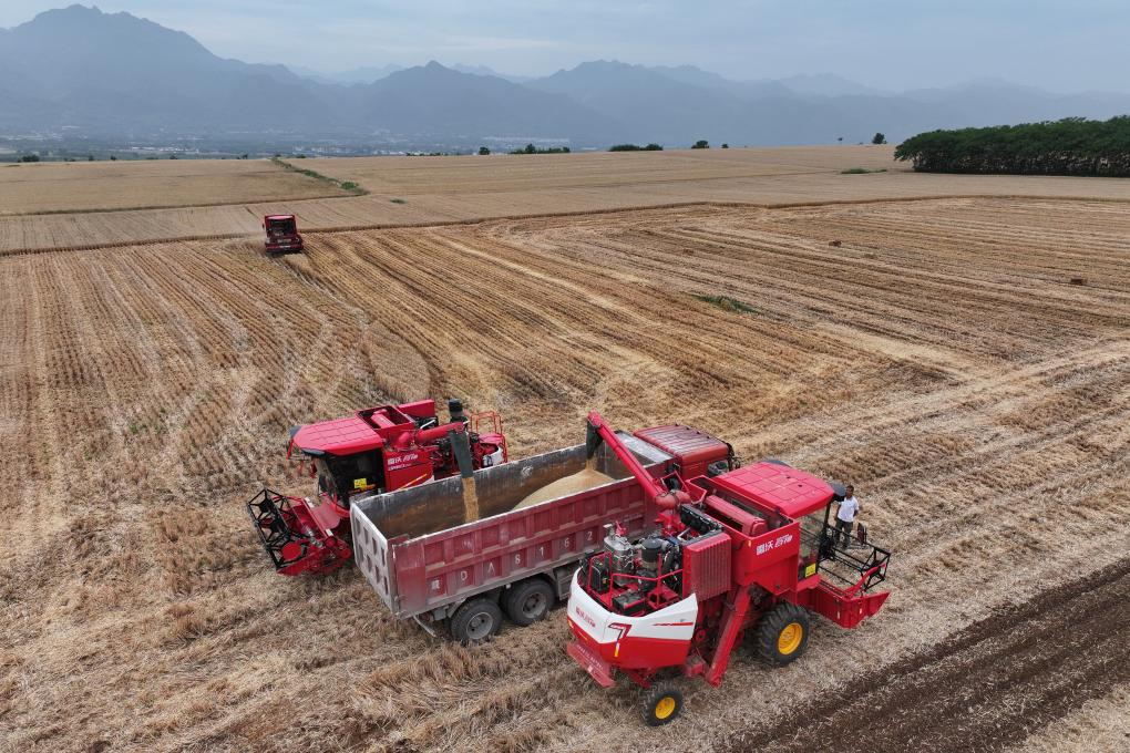 2024年6月1日,在西安市长安区神禾塬万亩优质粮食生产基地,收割机将收获的粮食装车(无人机照片)。新华社记者 邵瑞 摄