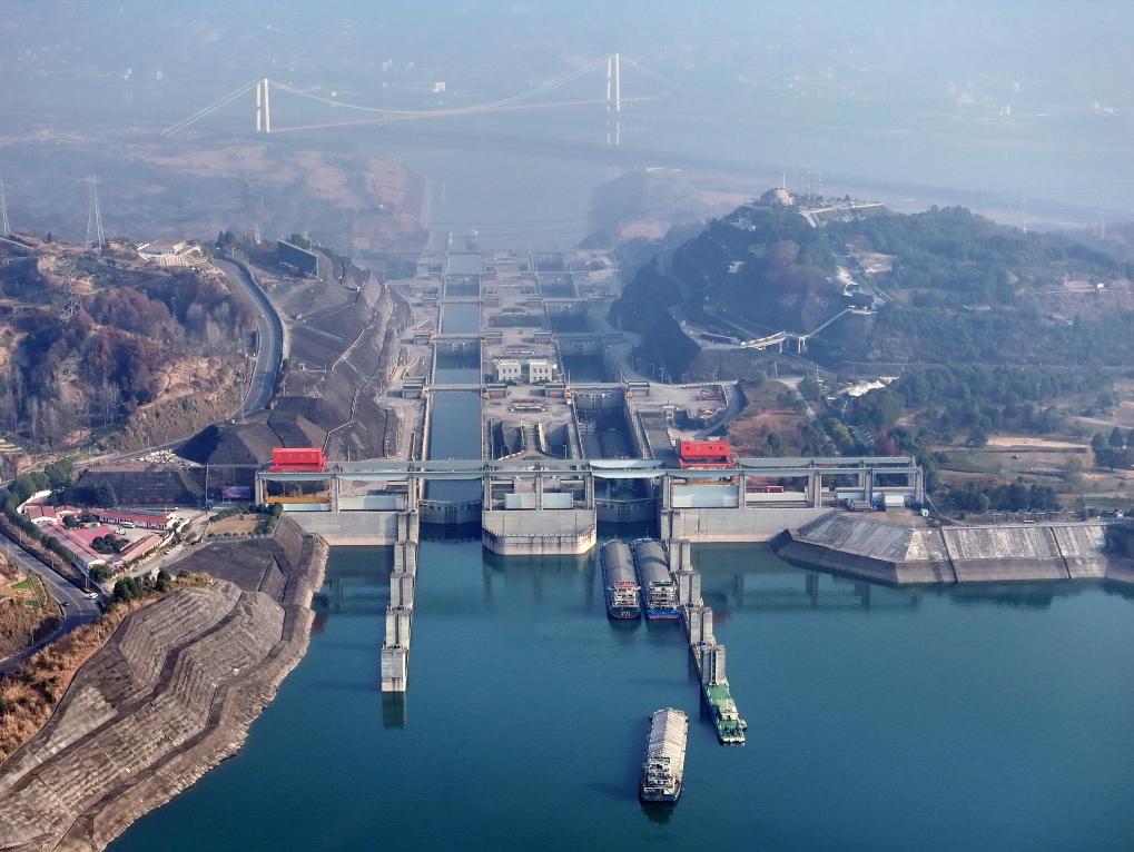 2025年1月1日,在湖北省宜昌市,船舶有序通过三峡枢纽五级船闸(无人机照片)。新华社发(王辉富摄)