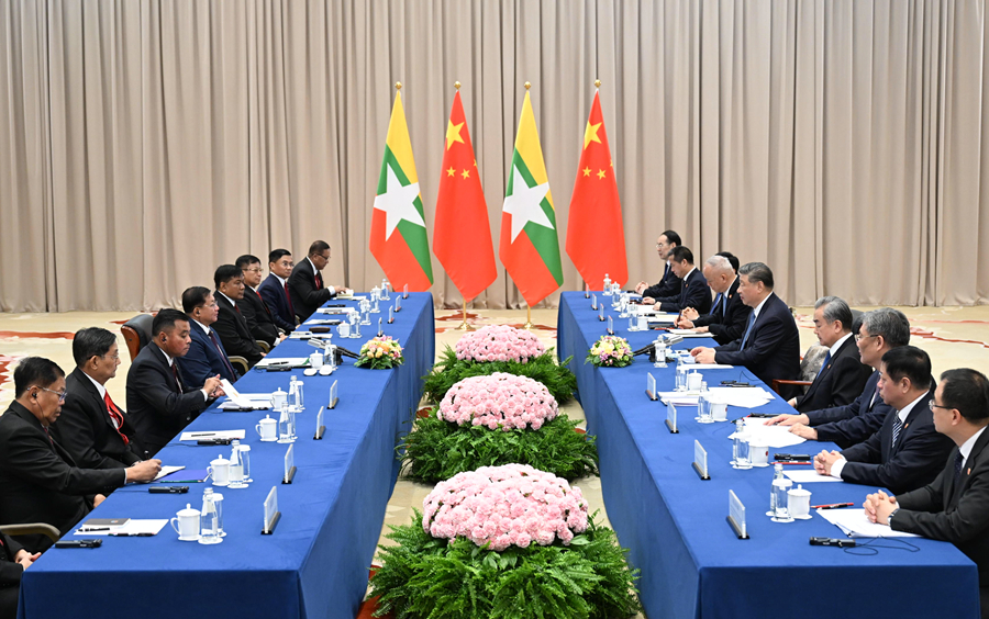 习近平指出,中缅是同甘共苦、守望相助的命运共同体。中缅两国共同倡导的和平共处五项原则和万隆精神历久弥坚,时代价值不断凸显。今年是两国建交75周年,中方将秉持睦邻、安邻、富邻、亲诚惠容、命运与共的理念方针,同缅方深化命运共同体建设,高质量共建“一带一路”,落实好全球发展倡议、全球安全倡议、全球文明倡议,给两国人民带来更多福祉。前不久,缅甸曼德勒强烈地震造成重大人员伤亡和财产损失,中方最早派出救援力量,援助紧急人道主义物资,愿继续提供帮助,支持缅方重建家园。中方支持缅甸走符合本国国情的发展道路,维护主权独立、领土完整、国家稳定,稳妥推进国内政治议程。双方要深化战略合作,持续推进中缅经济走廊重点项目建设。希望缅方切实保障在缅中方人员、机构、项目安全,加力打击网赌电诈等跨境犯罪。双方要共同捍卫以联合国为核心的国际体系和以国际法为基础的国际秩序,维护发展中国家正当权益。