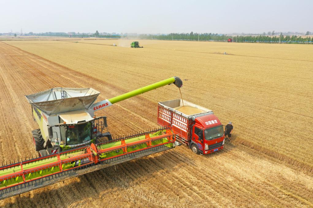 6月2日,农机手驾驶联合收割机在山东省聊城市茌平区贾寨镇草林张村麦田里收割小麦。新华社发(赵玉国摄)