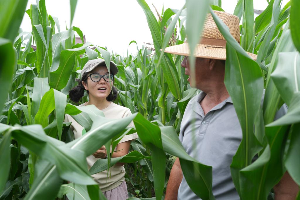 2025年7月17日,在浙江省台州市椒江区下陈街道横河陈村,青年创业者陈艳(左)在她开设的观光农场内和本地农民讨论庄稼长势。新华社记者 翁忻旸 摄