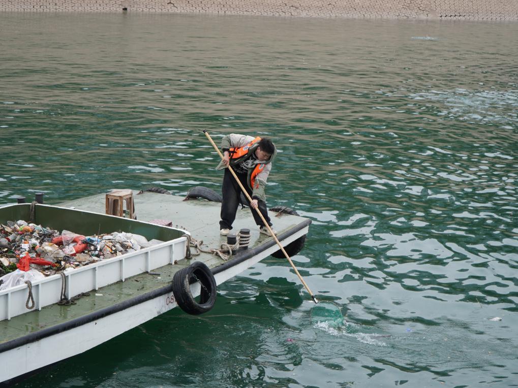 最辛苦的时候是夏季汛期。清漂队员不仅要头顶烈日,垃圾也来得又快又猛,往往是平日数倍,还常常随水流冲进偏远支流。机械化清漂船难以驶入狭窄支流,只能靠人工打捞。