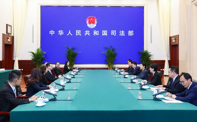 4月2日,司法部部长贺荣在京会见澳门特别行政区检察院检察长唐晓峰一行。