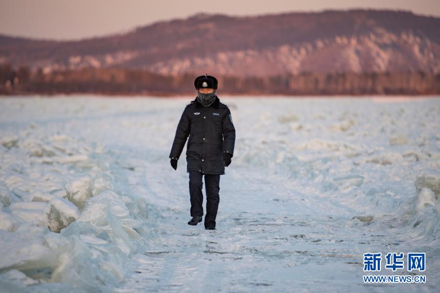 2021年1月9日,史先强在洛古河村旁封冻的黑龙江面上进行边境巡逻。新华社记者 谢剑飞 摄