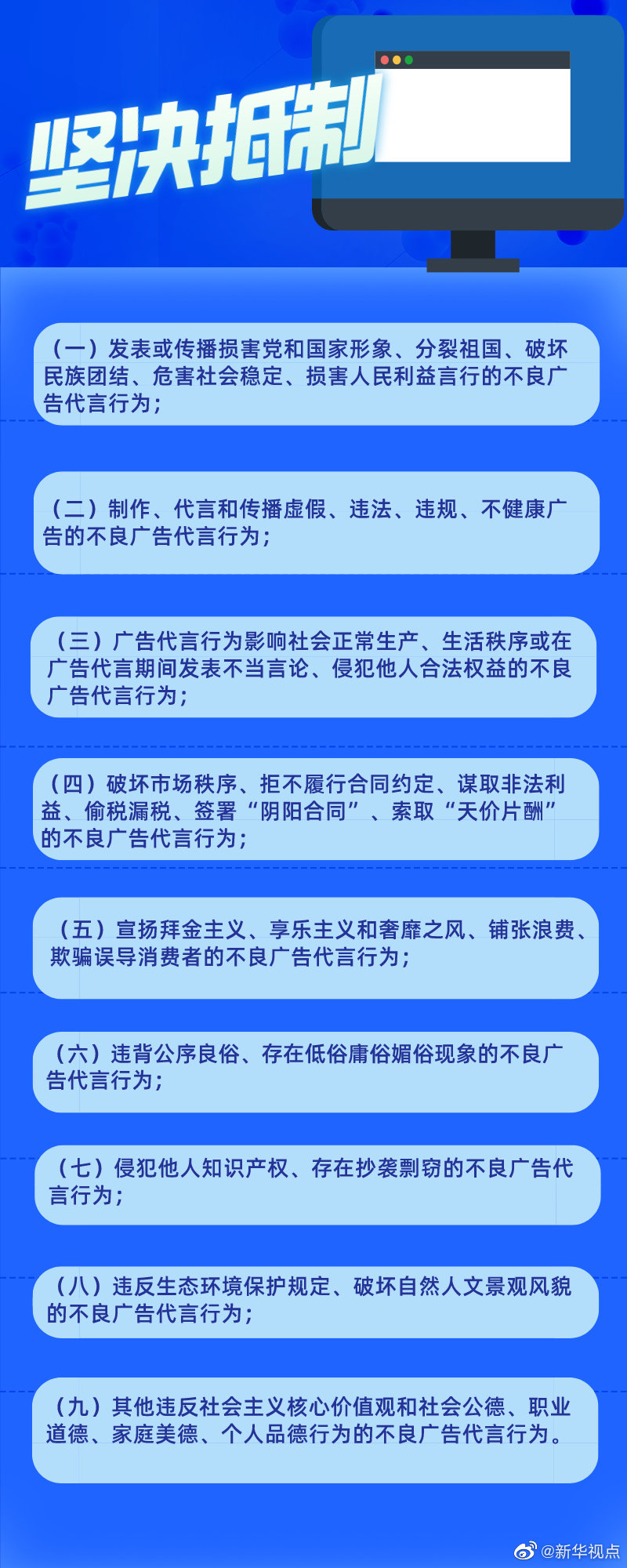 中国文联16日发布《文艺工作者广告代言自律公约》,提出坚决抵制破坏市场秩序、拒不履行合同约定、谋取非法利益、偷税漏税、签署“阴阳合同”、索取“天价片酬”;侵犯他人知识产权、存在抄袭剽窃;违反生态环境保护规定、破坏自然人文景观风貌等9项不良广告代言行为。(记者王鹏)