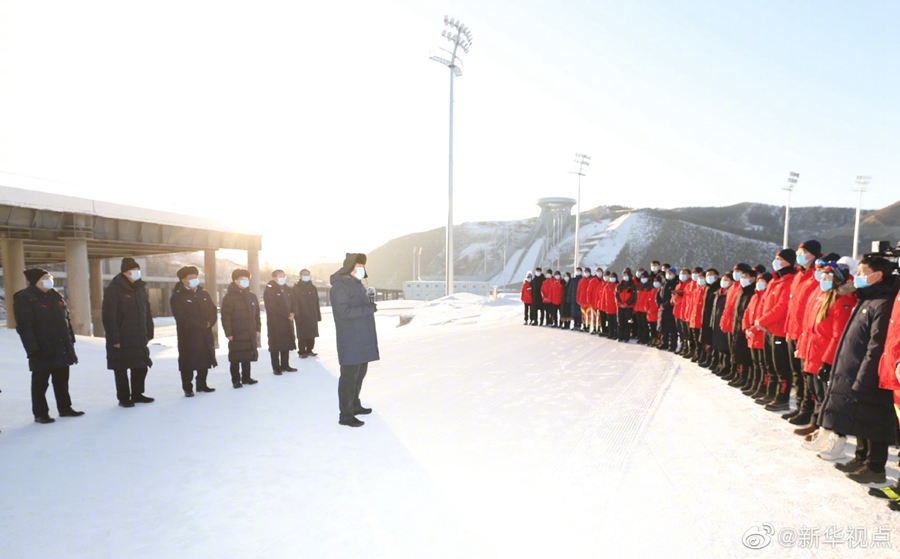 19日傍晚,位于张家口市崇礼区的国家冬季两项中心,白雪晚霞相辉映,“中国冰雪,加油”的呐喊声此起彼伏。习近平总书记同国家冬季两项、跳台滑雪队运动员、教练员和张家口赛区运行保障团队、建设者代表等亲切交流。习近平指出,现在离北京冬奥会还有一年多时间,各项筹办工作进展顺利,所有竞赛场馆已全部完工,京张高铁、京礼高速全线通车,许多冰雪项目从无到有,有些达到世界先进水平,这些都充分体现了党的领导和我国社会主义制度的显著优势。(文字记者:张晓松、朱基钗 摄影记者:王晔)