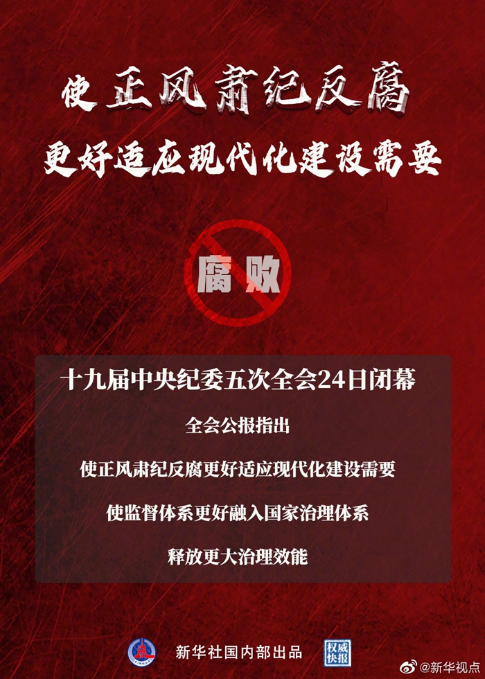 24日,十九届中央纪委五次全会闭幕。全会公报指出:使正风肃纪反腐更好适应现代化建设需要,使监督体系更好融入国家治理体系,释放更大治理效能。(记者:朱基钗、孙少龙;海报设计:朱舜)