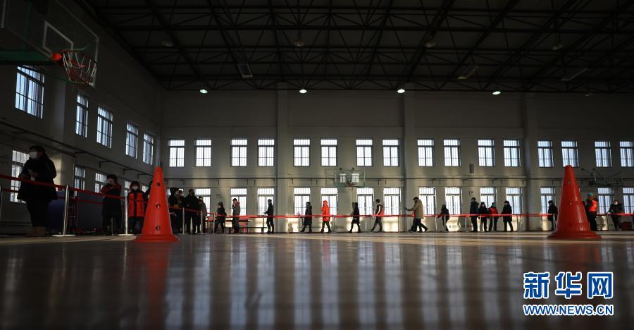 1月11日,在沈阳市铁西区彰驿学校检测点,居民排队等待核酸采样。新华社记者 杨青 摄