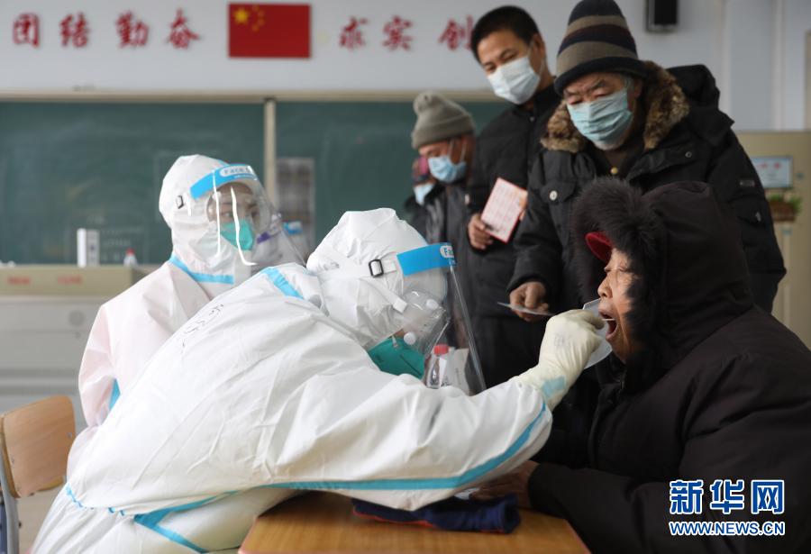 1月11日,在沈阳市铁西区彰驿学校检测点,居民接受核酸采样。新华社记者 杨青 摄