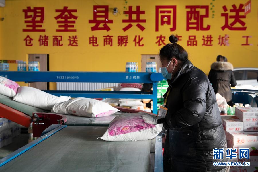 1月15日,工作人员在望奎县农村电商物流配送中心搬运生活物资。新华社发(张涛 摄)