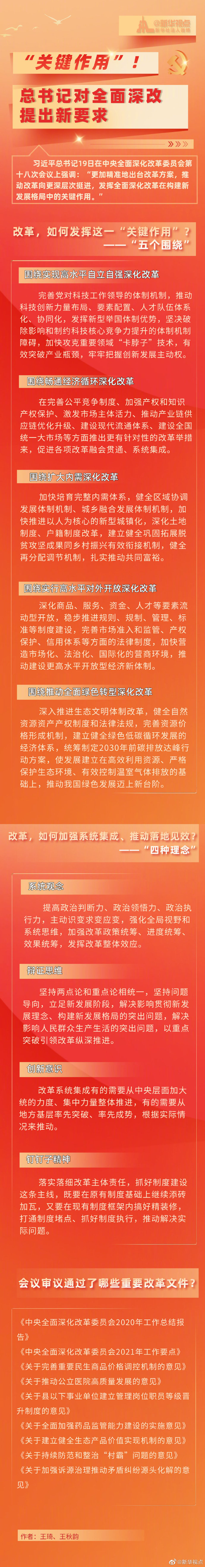 习近平总书记19日在中央全面深化改革委员会第十八次会议上强调:“更加精准地出台改革方案,推动改革向更深层次挺进,发挥全面深化改革在构建新发展格局中的关键作用。”读图,来看这一“关键作用”——