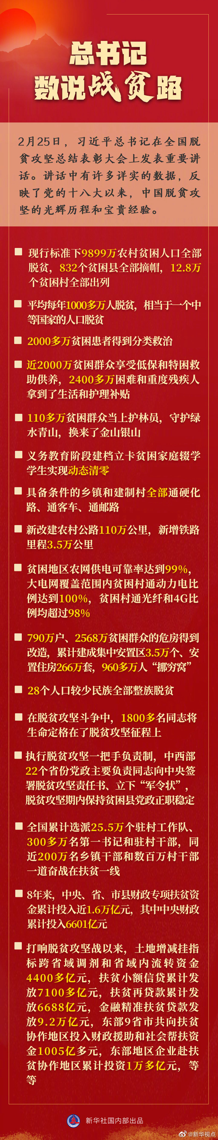 2月25日,习近平总书记在全国脱贫攻坚总结表彰大会上发表重要讲话。讲话中有许多详实的数据,反映了党的十八大以来,中国脱贫攻坚的光辉历程和宝贵经验。