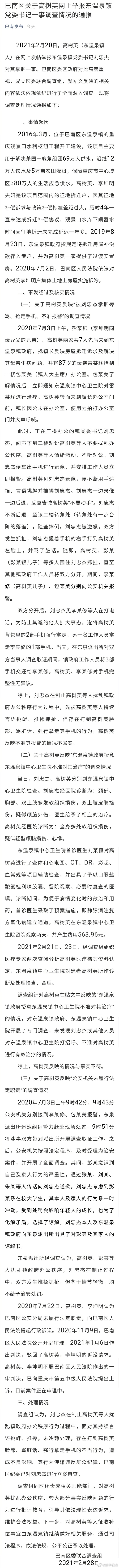 重庆市巴南区委联合调查组28日发布《关于高某英网上举报东温泉镇党委书记一事调查情况的通报》称,调查组认为,东温泉镇党委书记刘忠杰在制止高树英等人扰乱镇政府办公秩序行为过程中,面对其持续言语挑衅、推搡,未冷静处理,存在打到高树英脸部、骂脏话、强行拿走手机的不当行为,造成不良影响。其行为涉嫌违反群众纪律,巴南区纪委已对刘忠杰进行立案审查。