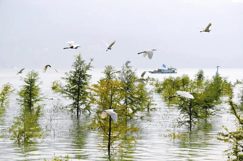 人民法院认真贯彻落实习近平生态文明思想,努力为生态文明建设与绿色发展提供优质司法服务。在长江三峡库区,为解决库区消落带植物存活的治理难题,重庆法院引进了耐淹耐旱的中山杉。图为重庆法院长江三峡库区生态修复司法保护示范林的中山杉在水库蓄水时被部分淹没的景象。 最高人民法院供图