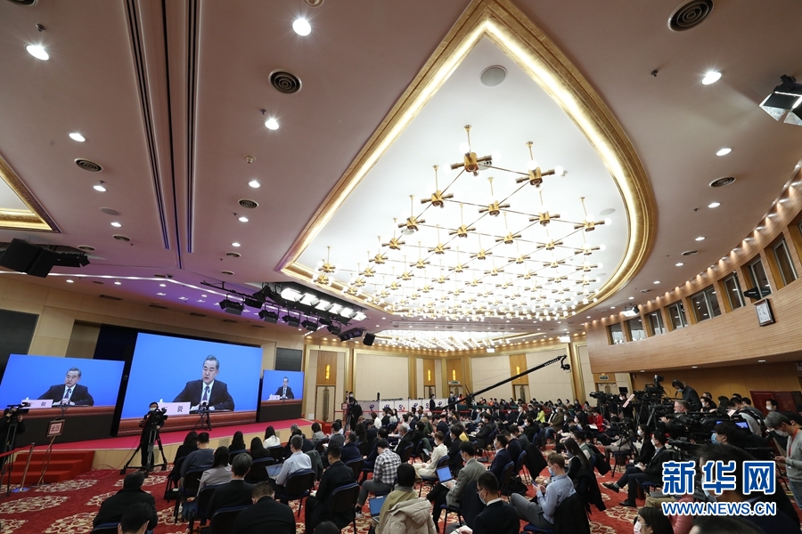 3月7日,十三届全国人大四次会议在北京人民大会堂新闻发布厅举行记者会,邀请国务委员兼外交部长王毅就“中国外交政策和对外关系”相关问题回答中外记者提问。为有效防控疫情,共同维护公共卫生与健康,记者会采用网络视频形式进行。这是记者在梅地亚中心多功能厅采访。 新华社记者 金立旺 摄