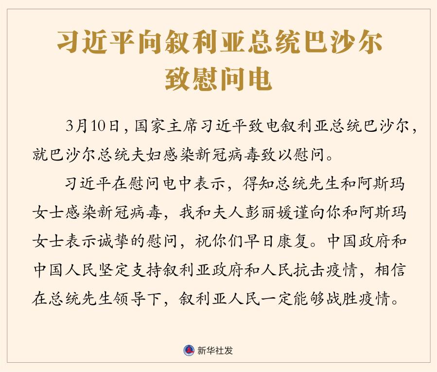 习近平在慰问电中表示,得知总统先生和阿斯玛女士感染新冠病毒,我和夫人彭丽媛谨向你和阿斯玛女士表示诚挚的慰问,祝你们早日康复。中国政府和中国人民坚定支持叙利亚政府和人民抗击疫情,相信在总统先生领导下,叙利亚人民一定能够战胜疫情。