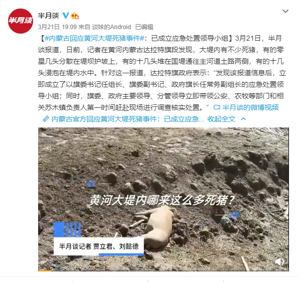 3月21日,有媒体报道称,日前,记者在黄河内蒙古达拉特旗段发现,大堤内有不少死猪,有的零星几头分散在堤坝护坡上,有的十几头堆在国堤通往主河道土路两侧,有的十几头浸泡在堤内水中。针对这一报道,达拉特旗政府表示:“发现该报道信息后,立即成立了以旗委书记任组长、旗委副书记、政府旗长任常务副组长的应急处置领导小组;同时,旗委、政府主要领导、分管领导立即带领公安、农牧等部门和相关苏木镇负责人第一时间赶赴现场进行调查核实处置。”