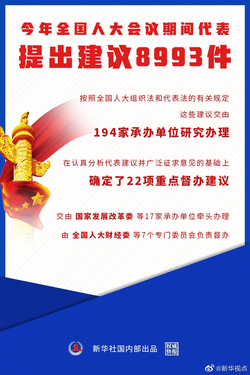 记者6日从在京召开的十三届全国人大四次会议代表建议交办会上获悉,今年全国人大会议期间代表共提出建议8993件。按照全国人大组织法和代表法的有关规定,这些建议交由194家承办单位研究办理。在认真分析代表建议并广泛征求意见的基础上,全国人大常委会办公厅确定了22项重点督办建议,涉及代表建议300多件,交由国家发展改革委等17家承办单位牵头办理,由全国人大财经委等7个专门委员会负责督办。(记者:陈菲 海报设计:张晨光)