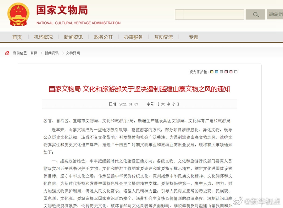 国家文物局、文化和旅游部近日印发通知,明确要求坚决刹住滥建山寨文物之风。各级文物行政部门要依法加强管理,对文物保护单位应当尽可能实施原址保护;对不可移动文物进行修缮、保养、迁移,必须遵守不改变文物原状的原则;不可移动文物已经全部毁坏的,应当实施遗址保护,未经批准不得在原址重建;对馆藏文物和不可移动文物中单体文物的复制,必须严格依法履行审批手续。(记者施雨岑)