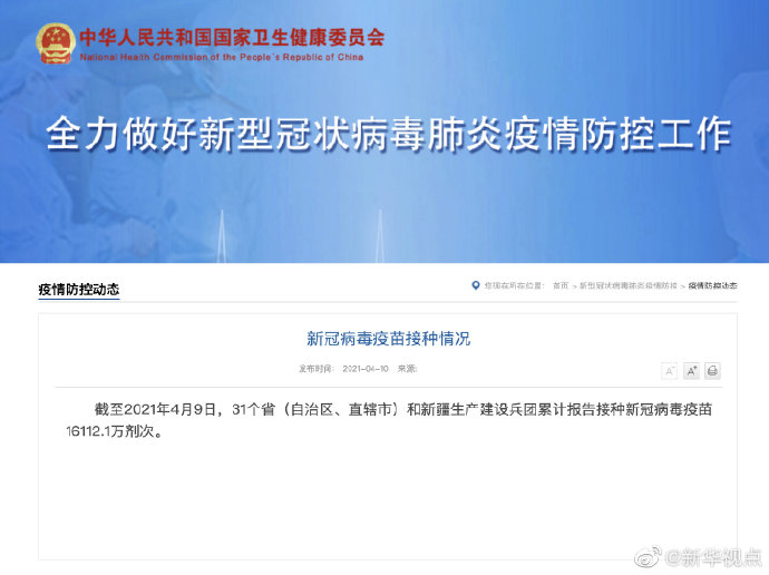 国家卫健委10日发布,截至2021年4月9日,31个省(自治区、直辖市)和新疆生产建设兵团累计报告接种新冠病毒疫苗16112.1万剂次。