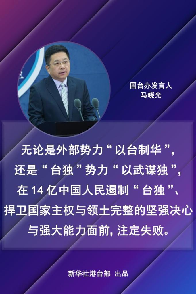 新华社北京4月14日电,国台办发言人马晓光14日在例行新闻发布会上应询表示,无论是外部势力“以台制华”,还是“台独”势力“以武谋独”,在14亿中国人民遏制“台独”、捍卫国家主权与领土完整的坚强决心与强大能力面前,注定失败。