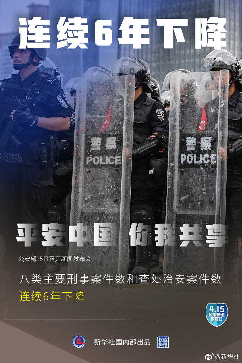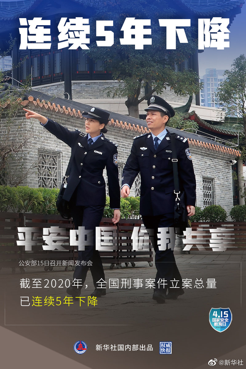 4月15日是第六个全民国家安全教育日,公安部15日召开新闻发布会介绍:2020年全国群众安全感为98.4%,全国居民对社会治安满意度达83.6%。截至2020年,全国刑事案件立案总量连续5年下降,八类主要刑事案件数和查处治安案件数连续6年下降。(记者熊丰,海报设计张晨光)