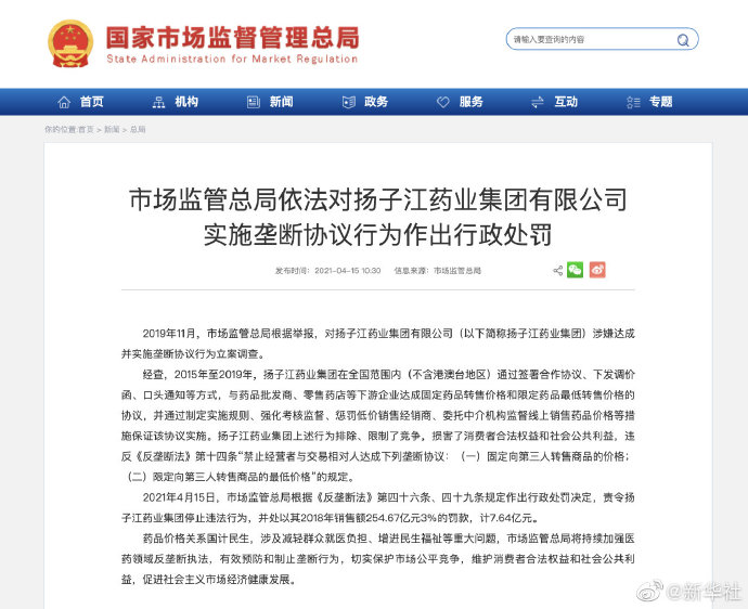 2021年4月15日,市场监管总局根据《反垄断法》第四十六条、四十九条规定作出行政处罚决定,责令扬子江药业集团停止违法行为,并处以其2018年销售额254.67亿元3%的罚款,计7.64亿元。