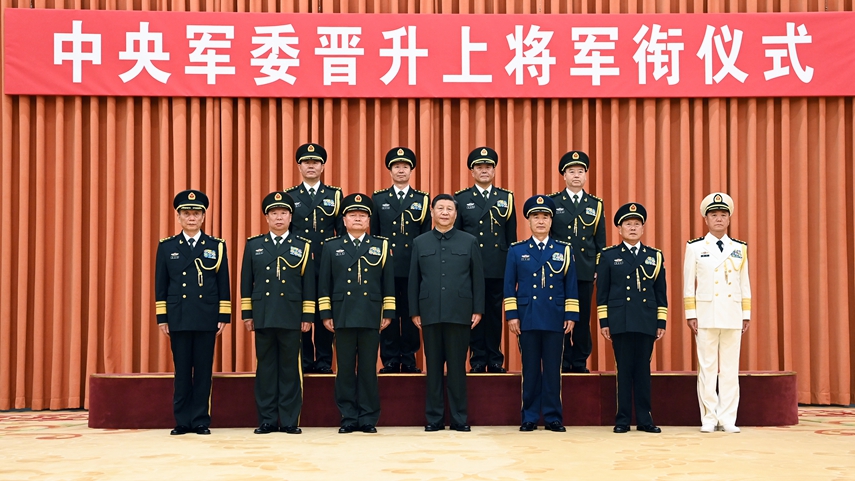 新华社北京7月5日电(记者梅常伟)中央军委晋升上将军衔仪式5日在北京八一大楼隆重举行。中央军委主席习近平向晋升上将军衔的军官颁发命令状。