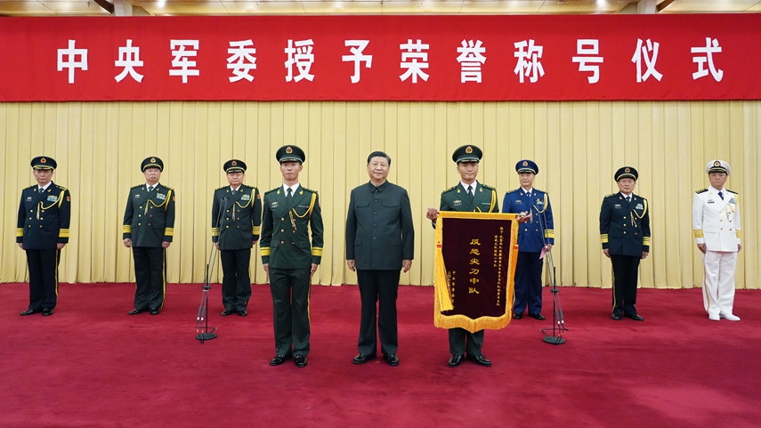 新华社北京7月5日电(记者梅常伟)中央军委授予荣誉称号仪式5日在京隆重举行。中央军委主席习近平向获得荣誉称号的单位颁授奖旗。