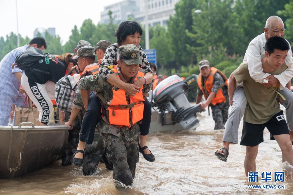 中部战区相继派出44批次救援梯队、8360名官兵,在郑州、洛阳、新乡等30余个险情地段投入救援。