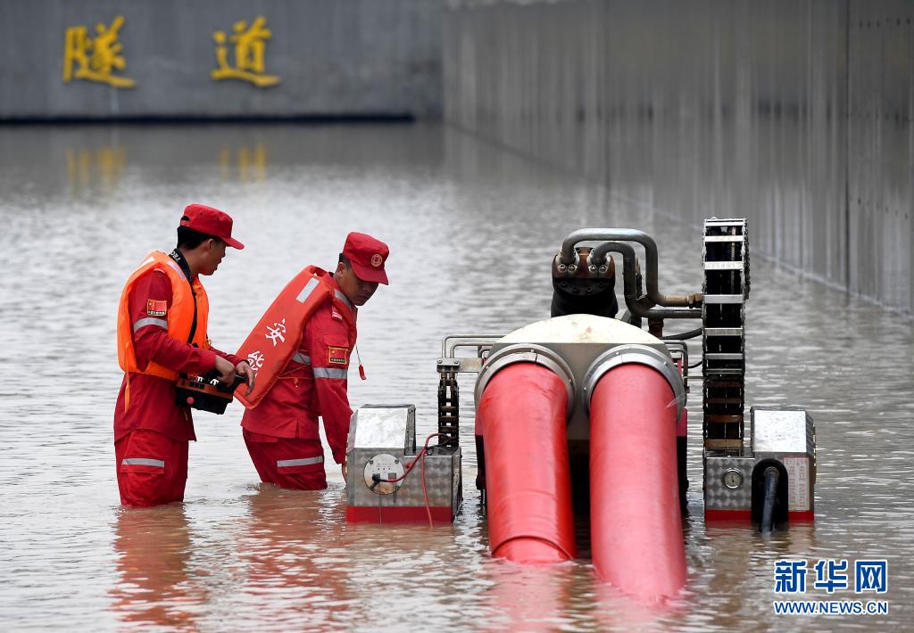7月22日,来自江西的救援人员在郑州市京广南路隧道进行排涝作业。新华社记者 李安 摄