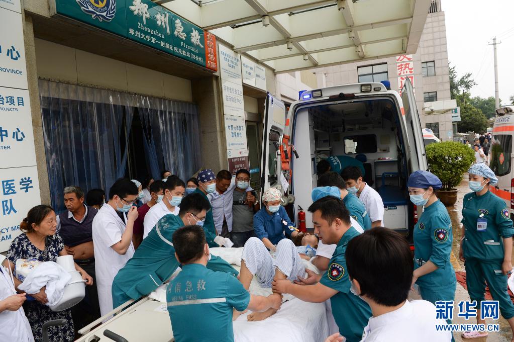 7月22日,在郑州市中牟县阜外华中心血管病医院附近的锦绣路与郑开大道交叉口,救援人员转移病患。新华社记者 才扬 摄