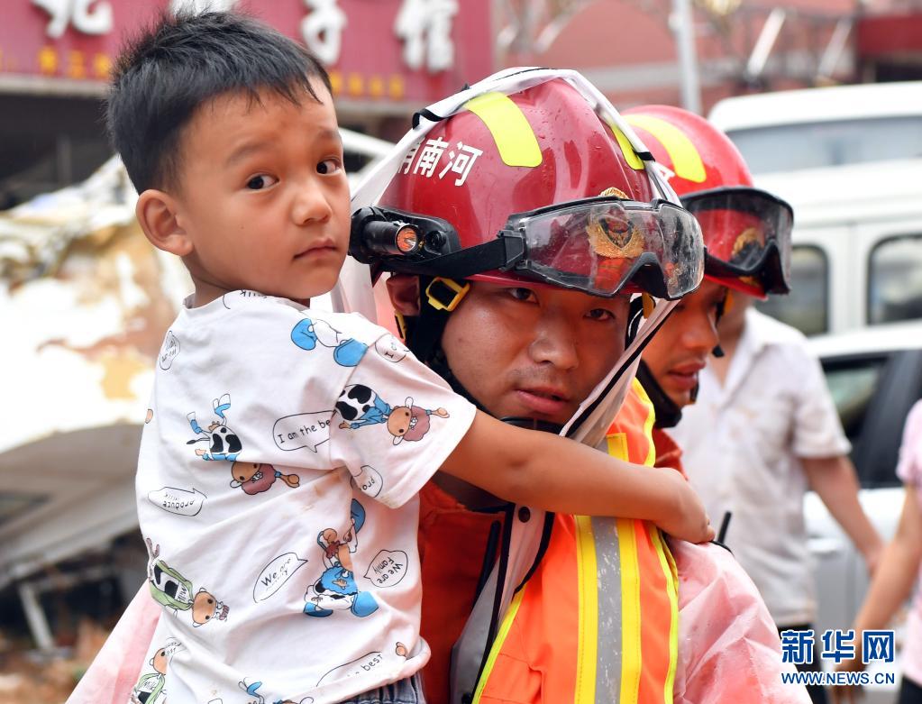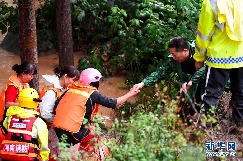 7月21日,在巩义市米河镇,消防救援人员帮助群众转移。新华社记者 李嘉南 摄