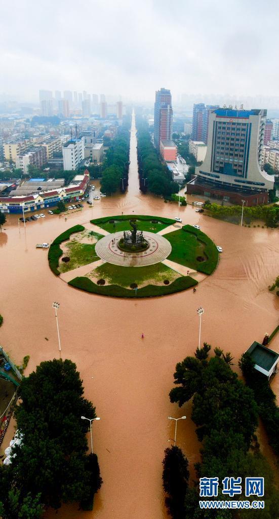 7月22日,河南安阳开发区七仙女环岛被淹没(无人机拍摄)。新华社发(马丁 摄)