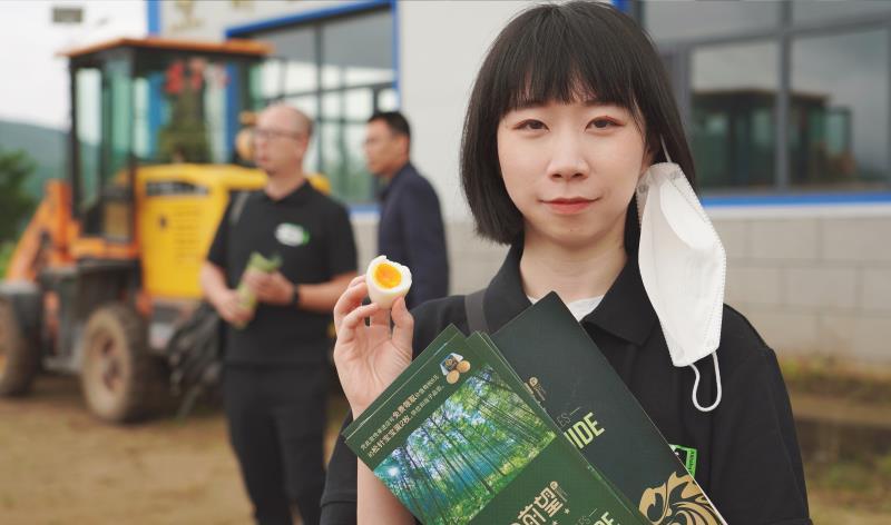 2020年8月,阿里乡村品牌设计师蒋宇宁在吉林省汪清县走访调研松针鸡养殖基地,手中拿着当地的松针鸡蛋。(受访者供图)