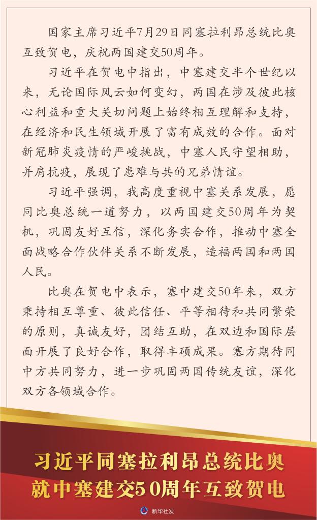 习近平在贺电中指出,中塞建交半个世纪以来,无论国际风云如何变幻,两国在涉及彼此核心利益和重大关切问题上始终相互理解和支持,在经济和民生领域开展了富有成效的合作。面对新冠肺炎疫情的严峻挑战,中塞人民守望相助,并肩抗疫,展现了患难与共的兄弟情谊。