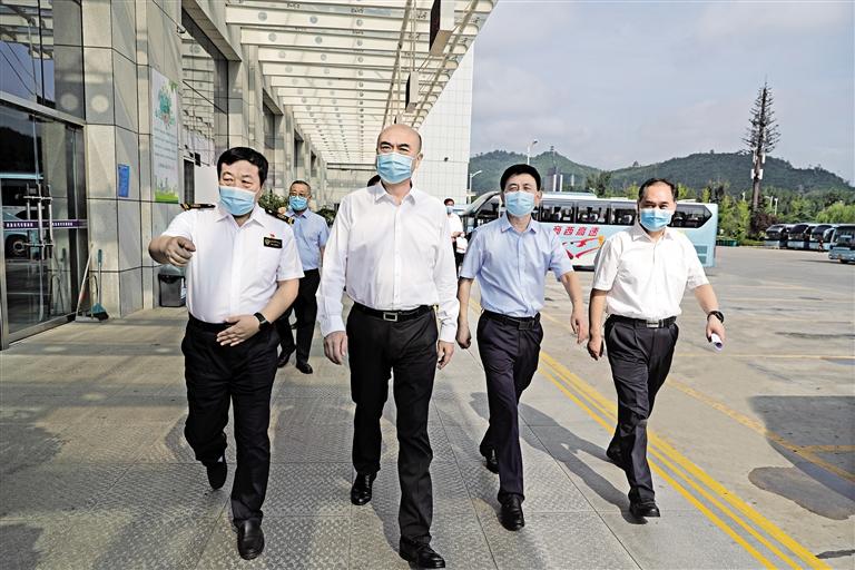 8月9日,省委书记刘国中到商洛市调研检查疫情防控和防汛救灾工作。图为他在商洛市汽车客运站,