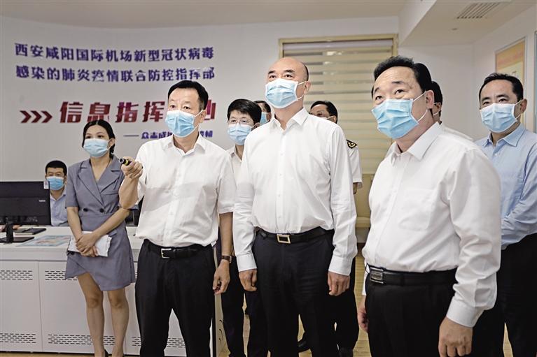 八月十日,省委书记刘国中到西安咸阳国际机场和西安北客站调研检查疫情防控工作。图为他在机场