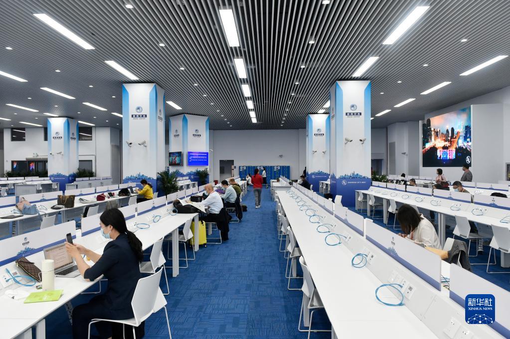 11月4日,媒体记者在第四届进博会新闻中心的媒体公共工作区工作。新华社记者 鲁鹏 摄