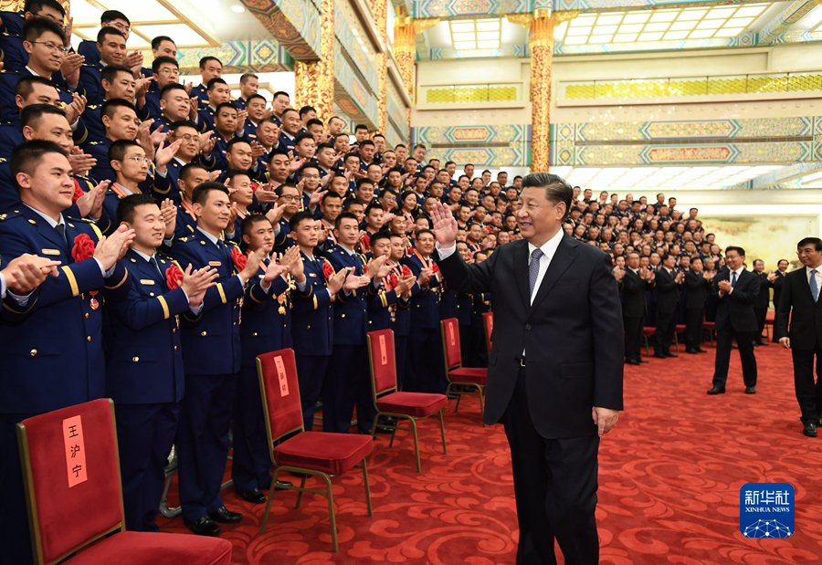 11月5日,党和国家领导人习近平、王沪宁、韩正等在北京人民大会堂会见全国应急管理系统先进模范和消防忠诚卫士表彰大会代表。新华社记者 谢环驰 摄