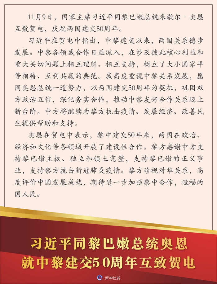 新华社北京11月9日电 11月9日,国家主席习近平同黎巴嫩总统米歇尔·奥恩互致贺电,庆祝两国建交50周年。