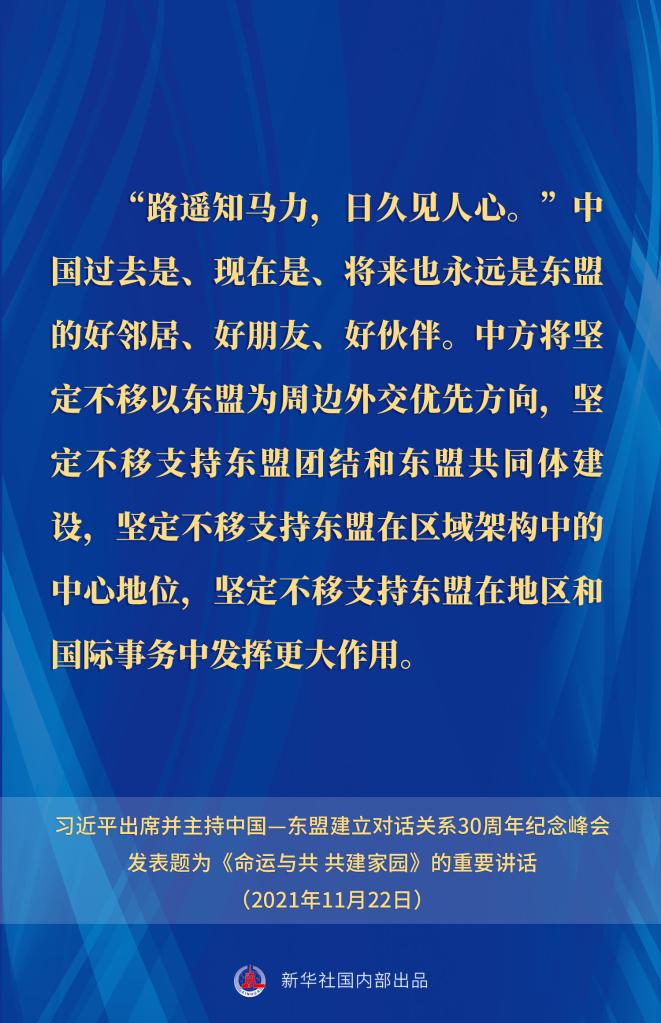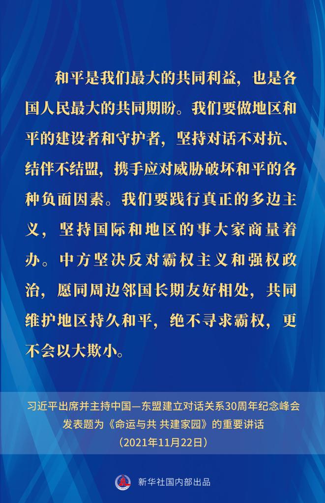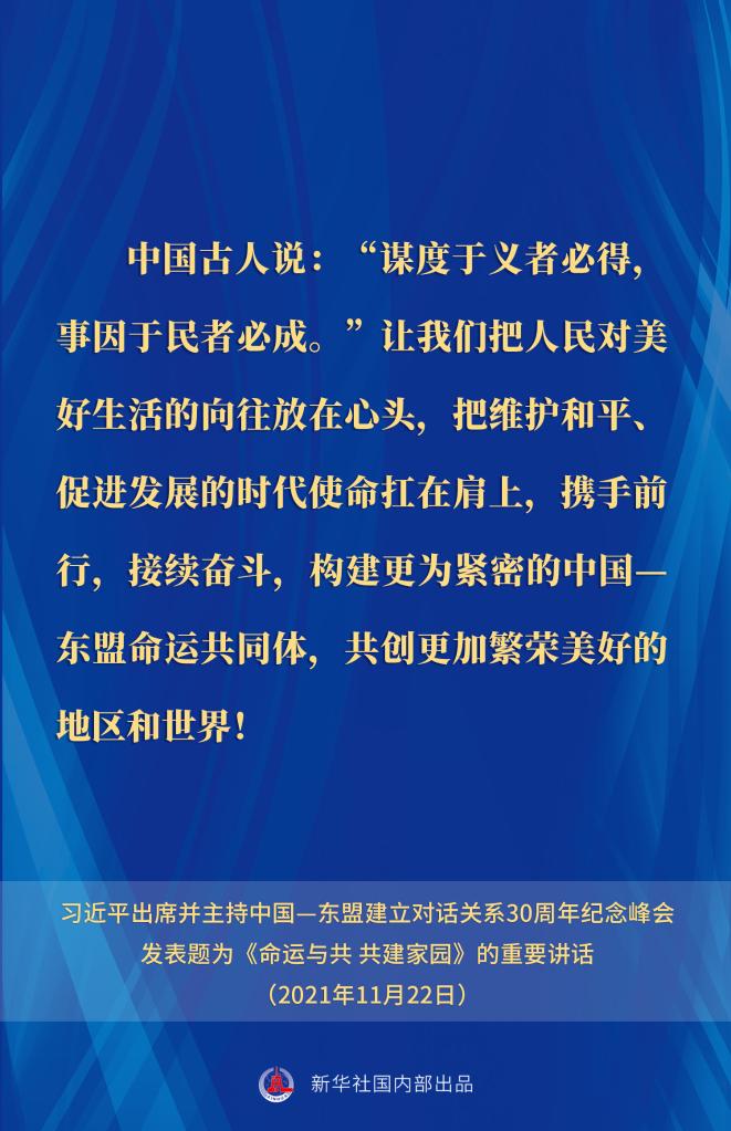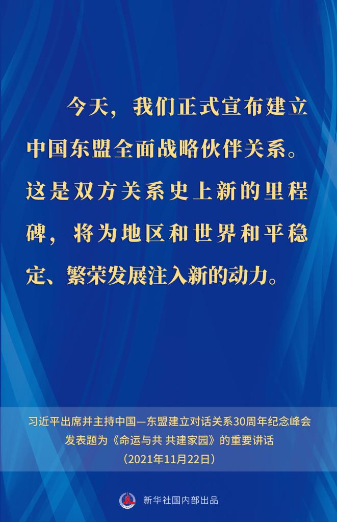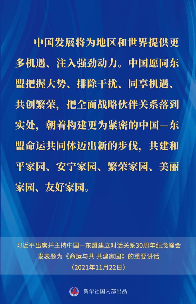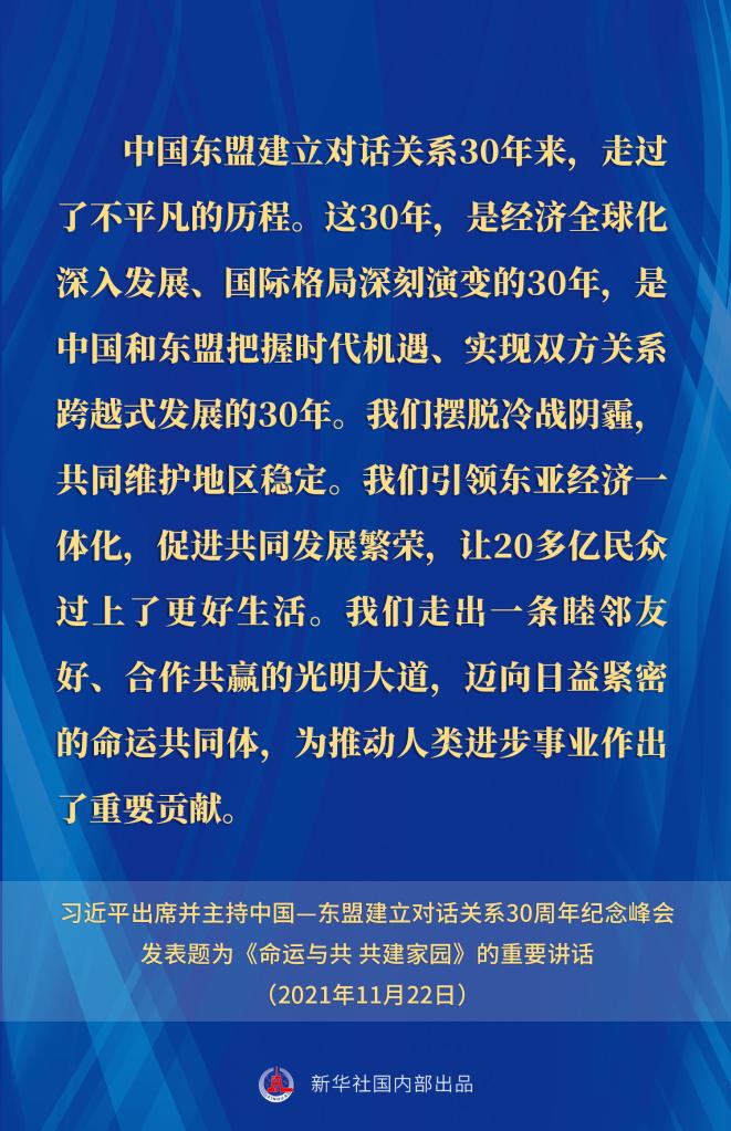 国家主席习近平22日上午在北京以视频方式出席并主持中国—东盟建立对话关系30周年纪念峰会,发表题为《命运与共 共建家园》的重要讲话。一起来看讲话要点↓