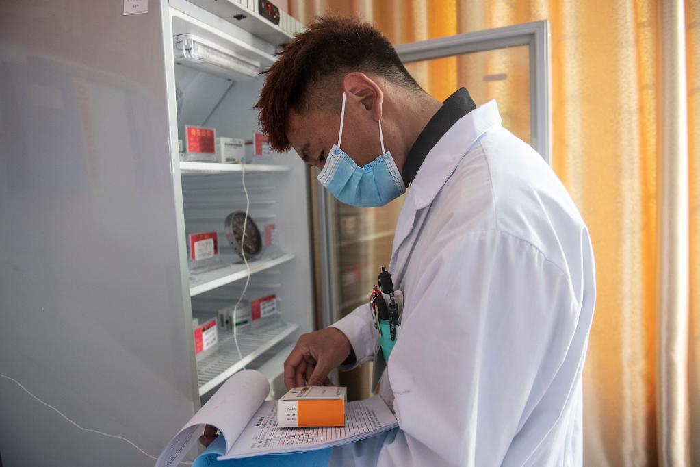 米玛次仁在林芝市巴宜区更章乡卫生院清点疫苗库存情况(2021年12月24日摄)。新华社记者 孙瑞博 摄