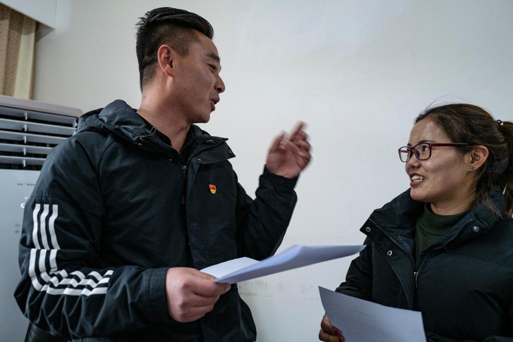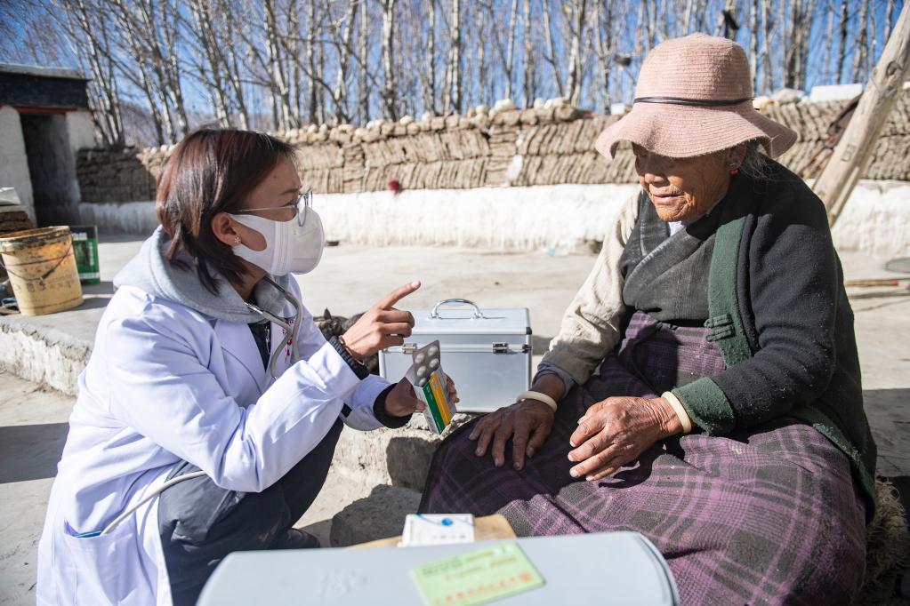 仓木拉(左)叮嘱村民要按时吃药(2021年12月21日摄)。新华社记者 孙瑞博 摄