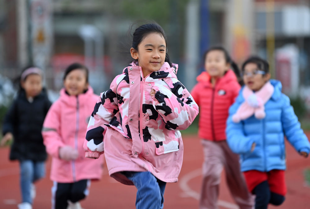 ↑在天津市河西区德贤小学,学生在课后素质拓展课上跑步锻炼(2021年11月11日摄)。