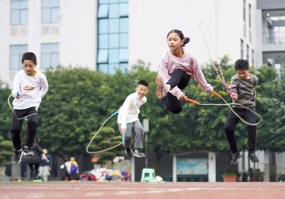 ↑重庆市九龙坡区西彭镇第一小学校学生在体育课上进行花样跳绳训练(2020年12月9日摄)。