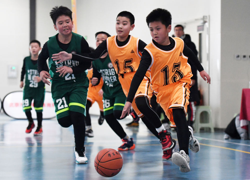 ↑怀柔区第三小学选手在2021年北京市第一届小学生篮球比赛中带球进攻(2021年12月11日摄)。