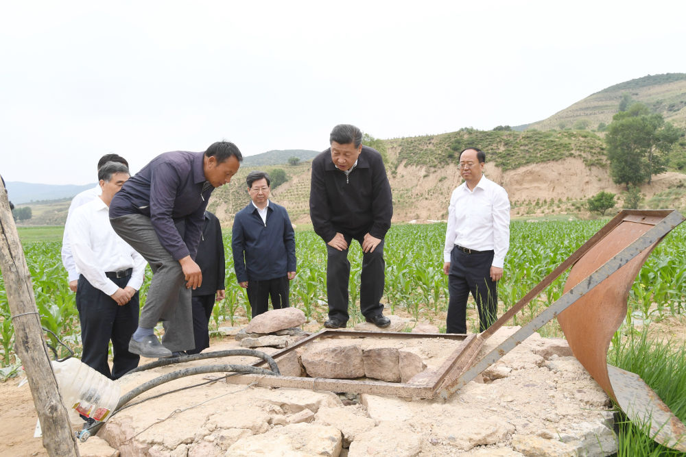 ↑2017年6月21日下午,习近平在山西省忻州市岢岚县赵家洼村察看作为全村唯一生产生活水源的浅层渗水井。