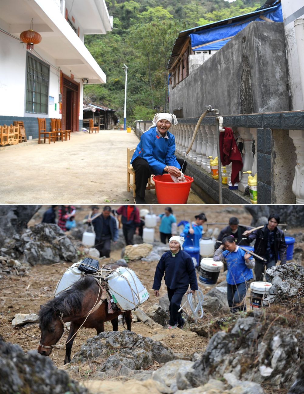 ↑拼版照片上图:广西百色市那坡县龙合乡明浪村弄蓬屯村民韦秀海用自来水洗衣服(2021年3月10日摄);下图:2010年3月29日,韦秀海(前)和村民一起走在取水的山间小路上。10多年来,尤其是实施精准扶贫以来,广西为留住地表水艰苦奋战,将水引进千家万户,彻底改变了大石山区肩挑马驮的用水状况,为乡村振兴打下坚实的基础。